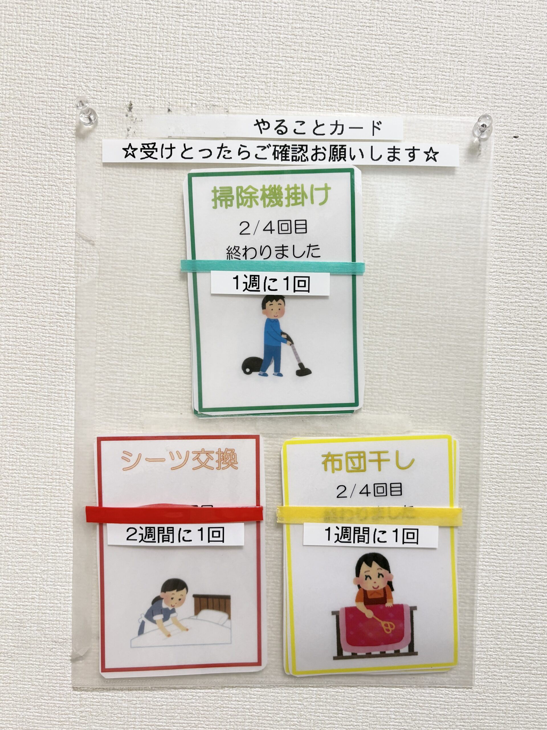 居室掃除や布団干しなど、日々の衛生活動が終わったら、利用者さんがスタッフにカードを渡すというシンプルな仕組み。
